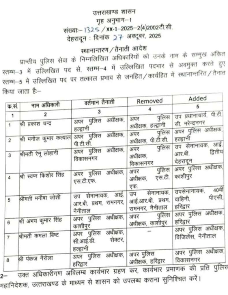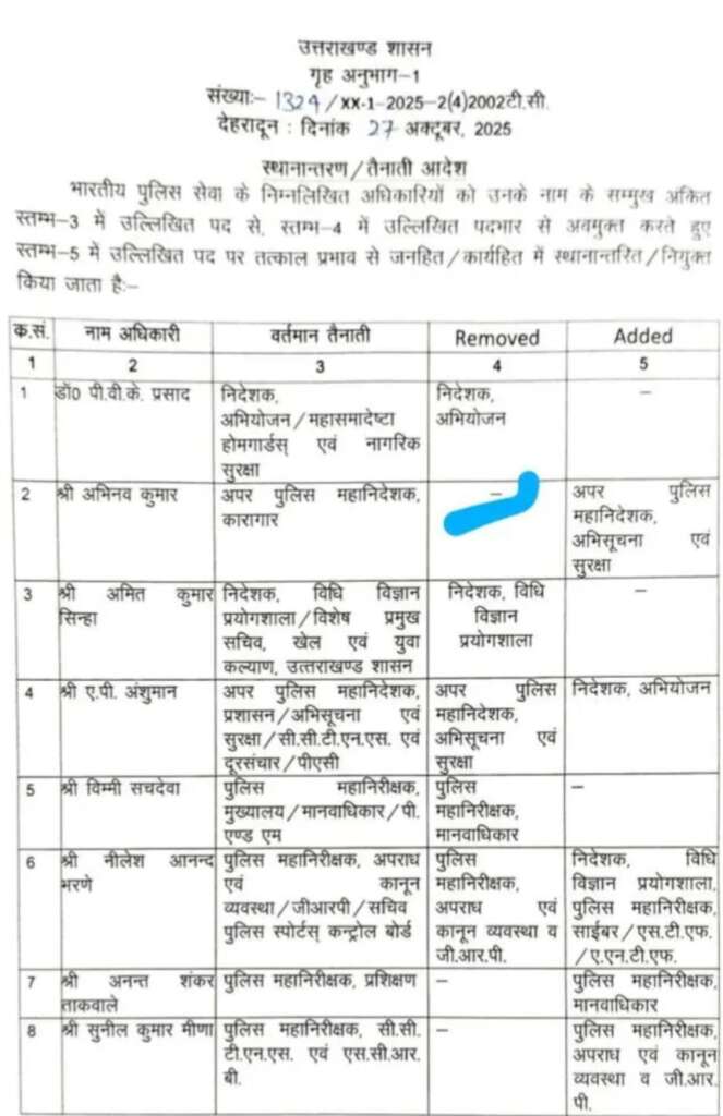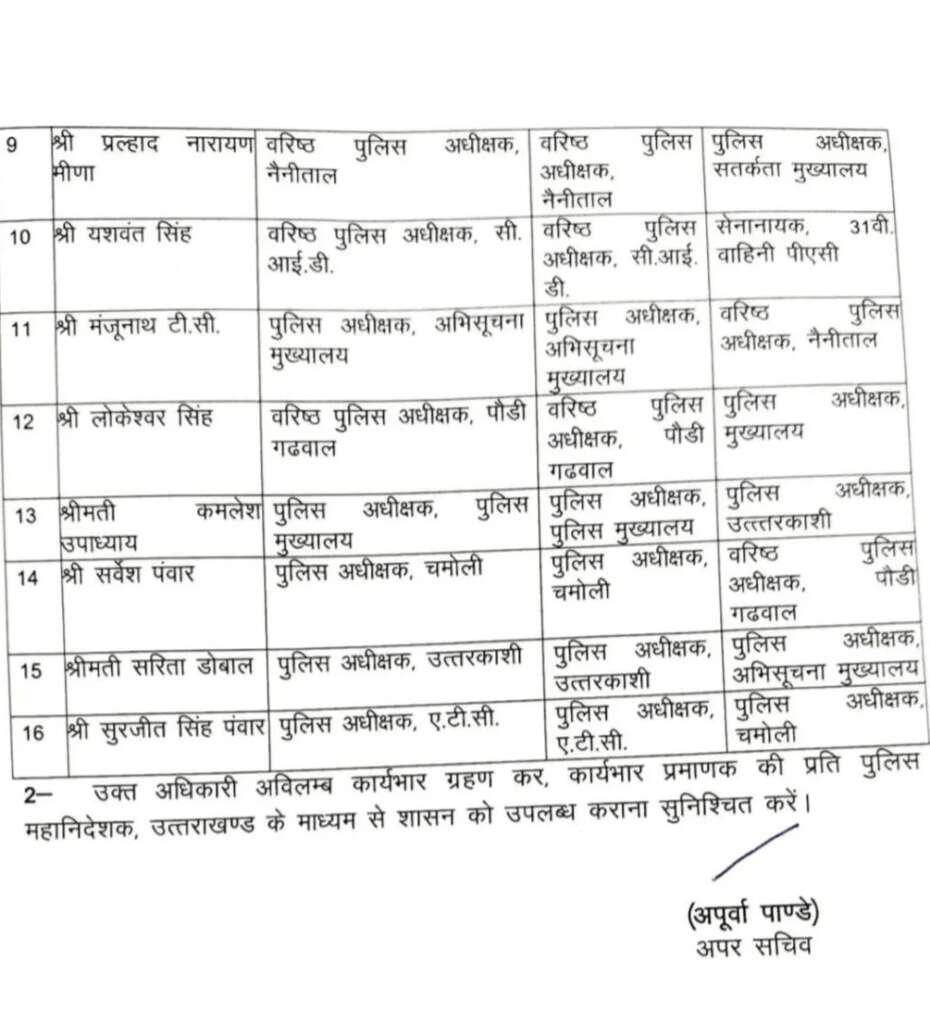 उत्तराखंड पुलिस विभाग में 16 आईपीएस और 8 पीपीएस अधिकारियों के तबादले, मंजूनाथ टीसी होगें अब नैनीताल के नए पुलिस कप्तान