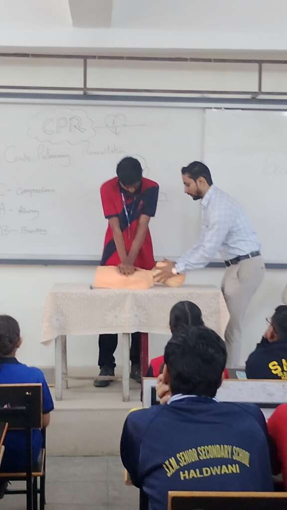 इसके पश्चात डॉ. अखिलेश जोशी ने कक्षा 9वीं एवं 11वीं के विद्यार्थियों को हार्ट अटैक, चक्कर आना तथा दौरा पड़ने जैसी आपात स्थितियों में क्या करना चाहिए, इस विषय पर उपयोगी जानकारी दी। उन्होंने सीपीआर विधि का प्रदर्शन कर बताया कि हृदयगति रुकने की स्थिति में किसी व्यक्ति की जान कैसे बचाई जा सकती है। जैसी आपात स्थितियों में क्या करना चाहिए, इस विषय पर उपयोगी जानकारी दी। उन्होंने सीपीआर विधि का प्रदर्शन कर बताया कि हृदयगति रुकने की स्थिति में किसी व्यक्ति की जान कैसे बचाई जा सकती है।
