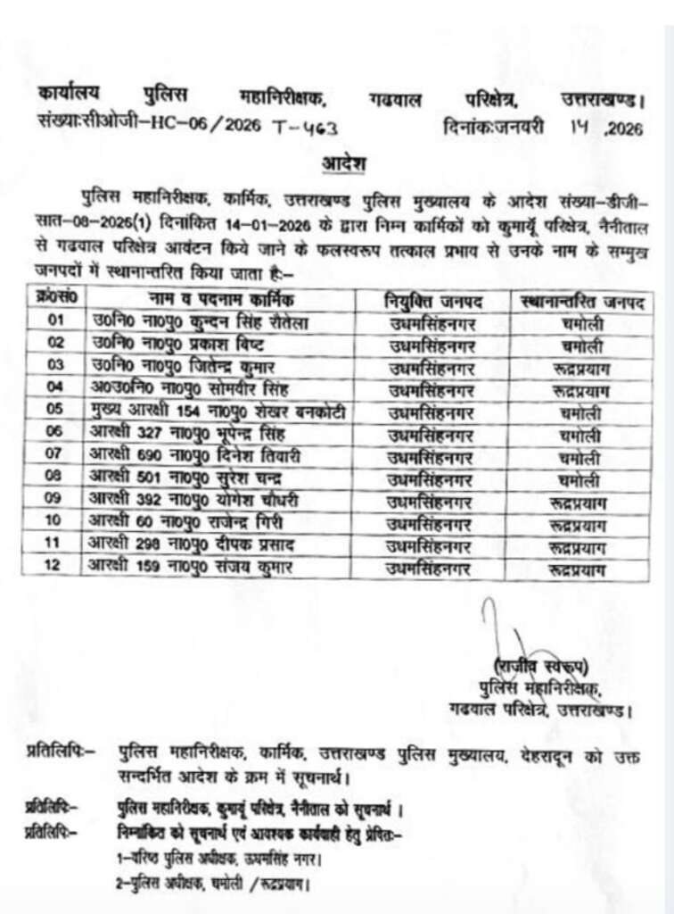 निष्पक्षता और पारदर्शिता बनाए रखने के उद्देश्य से प्रकरण से जुड़े कुल 12 पुलिस कर्मियों को तत्काल प्रभाव से गढ़वाल रेंज के जनपद चमोली और रुद्रप्रयाग स्थानांतरित किया गया है। इनमें 03 उपनिरीक्षक, 01 अपर उपनिरीक्षक, 01 मुख्य आरक्षी और 07 आरक्षी शामिल हैं।