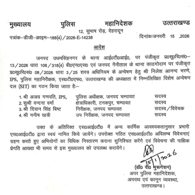 पुलिस मुख्यालय के निर्देश पर पुलिस महानिरीक्षक एसटीएफ नीलेश आनन्द भरणे की अध्यक्षता में पांच सदस्यीय विशेष जांच दल (SIT) का गठन किया गया है। SIT में पुलिस अधीक्षक चम्पावत अजय गणपति, क्षेत्राधिकारी टनकपुर वन्दना वर्मा, निरीक्षक दिवान सिंह बिष्ट और उपनिरीक्षक मनीष खत्री को शामिल किया गया है, जो पूरे प्रकरण की बारीकी से जांच करेंगे।