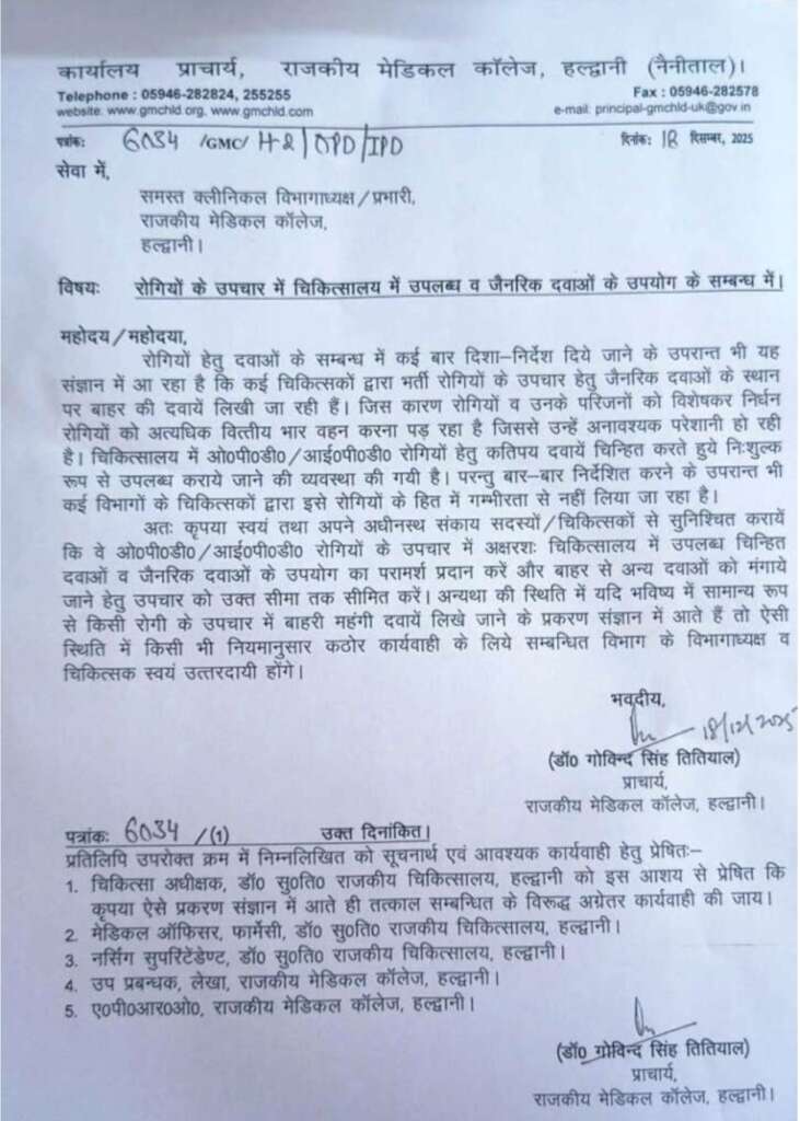प्राचार्य डॉ. गोविन्द सिंह तितियाल ने सभी क्लीनिकल विभागाध्यक्षों और चिकित्सकों को आदेश किया है कि ओपीडी एवं आईपीडी में भर्ती मरीजों के इलाज में केवल चिकित्सालय में उपलब्ध चिन्हित एवं जैनरिक दवाओं का ही प्रयोग किया जाए।