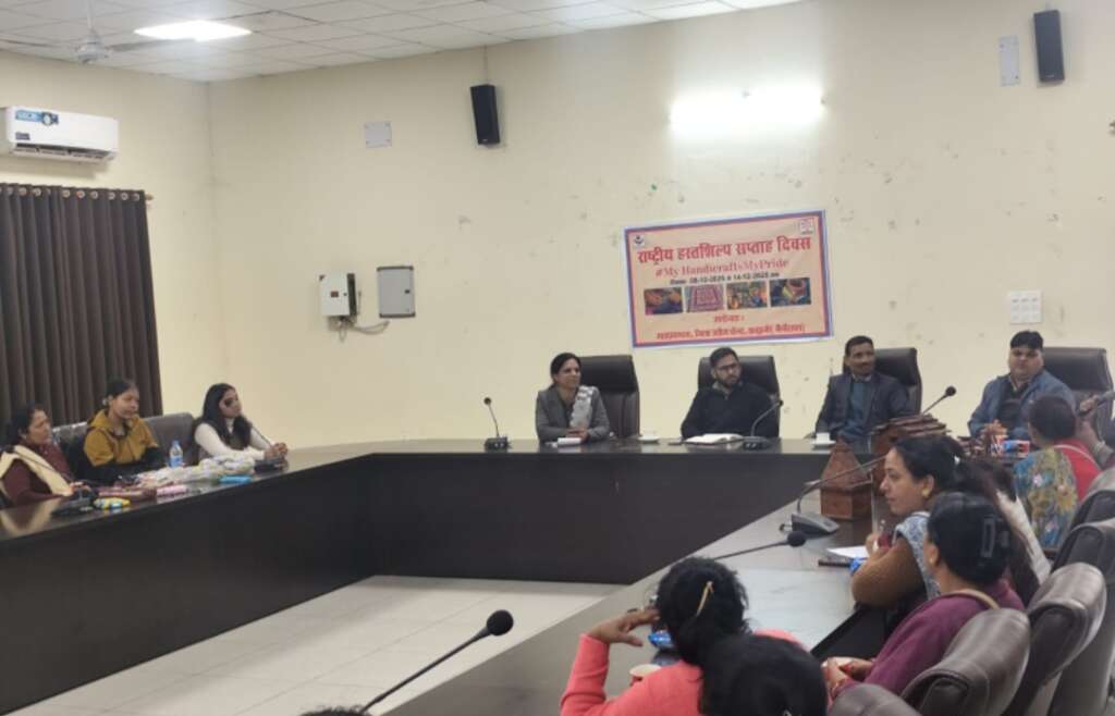 जिसके अनुपालन में सोमवार को जिला उद्योग केन्द्र के द्वारा स्थानीय हस्तशिल्प कारीगरों एवं हस्तशिल्पयों के क्षेत्र में रूचि रखने वाले उद्यमियों को हस्तशिल्प के क्षेत्र की जानकारी एवं हस्तकला को आगे बढ़ाने, बाजारों से ऑनलाइन जोड़ने, व निर्मित उत्पादों को बाजारों में प्रदर्शित व पैकेजिंग आदि की जानकारी प्रदान की गई।