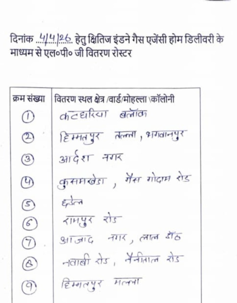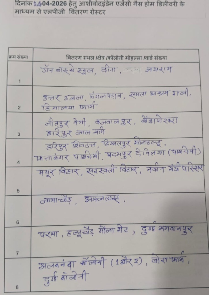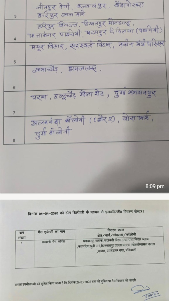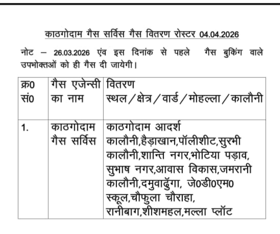 हल्द्वानी:- शहरी और ग्रामीण इलाकों में कल शनिवार 4 अप्रैल को कुमाऊँ मंडल विकास निगम द्वारा संचालित काठगोदाम गैस सर्विस एवं हल्द्वानी गैस सर्विस तथा इंडेन की निजी गैस ऐजेंसी, क्षितिज इंडेन गैस एजेंसी, आशीर्वाद इंडेन गैस एजेंसी द्वारा होम डिलीवरी का रोस्टर जारी किया गया है। (फर्स्ट इन फर्स्ट आउट) के आधार पर 26 मार्च तक की बुकिंग वाले उपभोक्ताओं को कल निम्न रोएस्टर के अनुसार गैस एजेंसियों द्वारा एलपीजी गैस सिलेंडर होम डिलीवरी द्वारा वितरित किये जायेंगे।