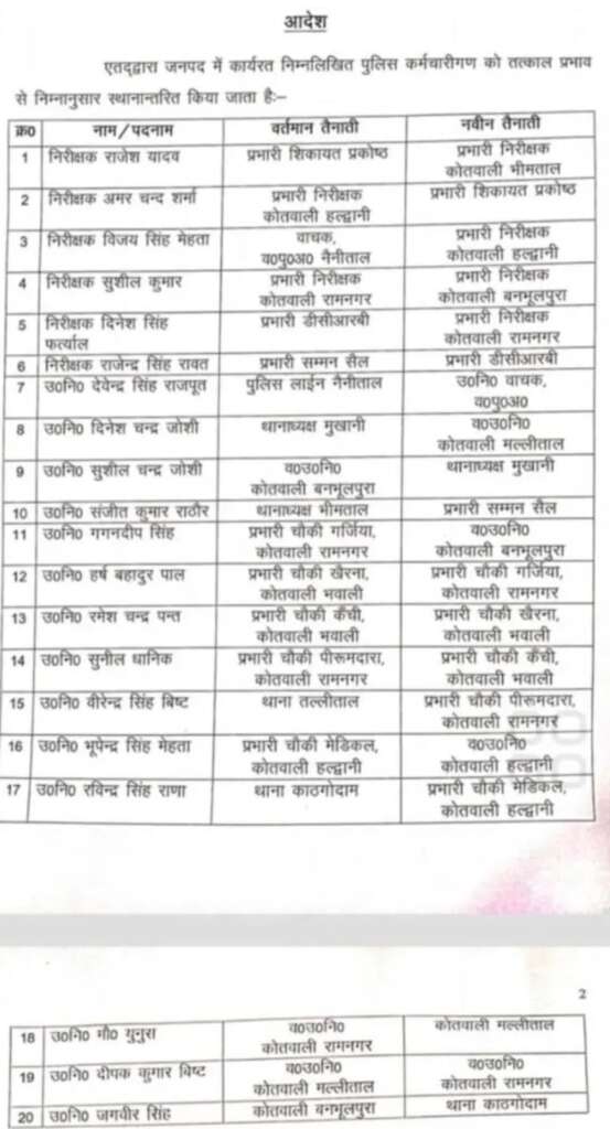 वरिष्ठ पुलिस अधीक्षक डॉ मंजूनाथ टीसी ने देर रात स्थानांतरण सूची जारी की। भीमताल में राजेश यादव को कोतवाल बनाया गया है। मुखानी के थानाध्यक्ष के साथ ही कई चौकी प्रभारी भी स्थानांतरित किए गए हैं। सूची देखें:-