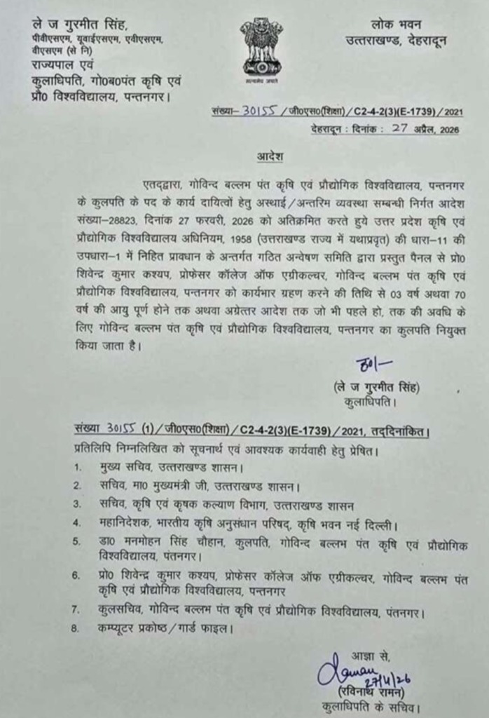 प्रोफेसर शिवेंद्र कुमार कश्यप बने गोविंद बल्लभ पंत कृषि विश्वविद्यालय के नए कुलपति, राज्यपाल ने जारी किए आदेश