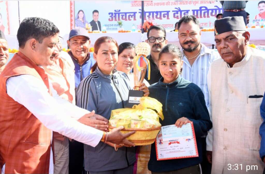 उन्होंने कहा कि प्रदेश के लिए पदक जीतने वाले खिलाड़ियों को आउट ऑफ टर्न नौकरी दी जा रही है, साथ ही अन्य सरकारी नौकरियों में भी उन्हें 4 प्रतिशत आरक्षण देने की व्यवस्था की गई है। मैराथन दौड़ में बालक और बालिका वर्ग में पूजा बिष्ट और नीरज नेगी प्रथम स्थान पर रहे, जबकि मेघा गोस्वामी और तुषार ने दूसरा स्थान हासिल किया । अनु भट्ट और सौरभ रावत तीसरे स्थान पर रहे। इन सभी को कैबिनेट मंत्री रेखा आर्या ने सम्मानित किया।